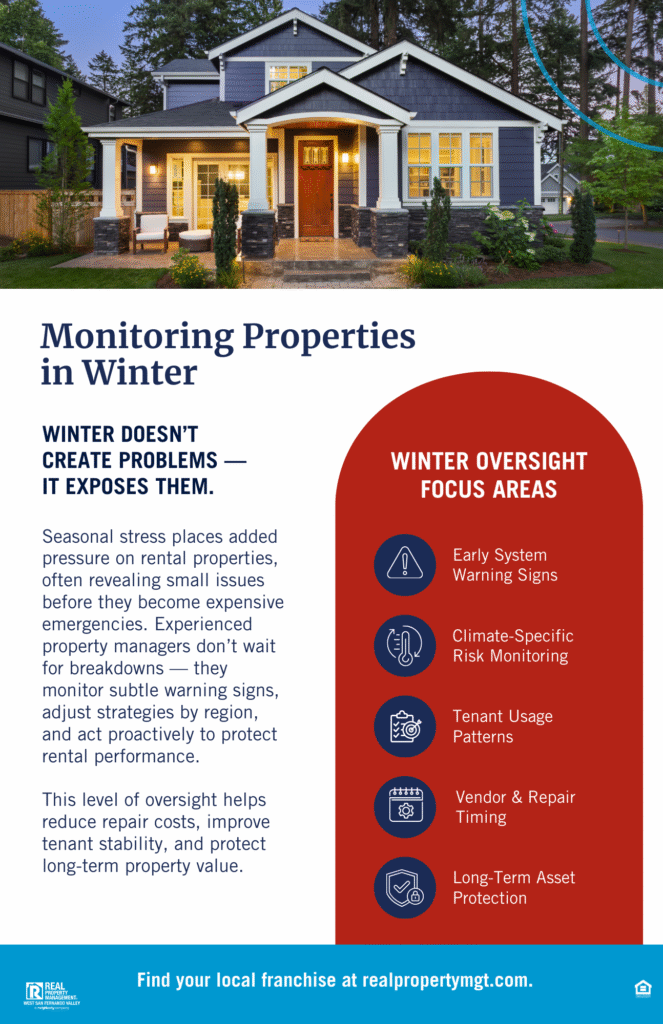 In colder regions, properties face freeze-related plumbing stress and increased heating demands. In milder or coastal areas, moisture intrusion and drainage challenges are more common. Even in warmer climates, winter can expose insulation gaps, strain HVAC systems, and bring unpredictable weather events.